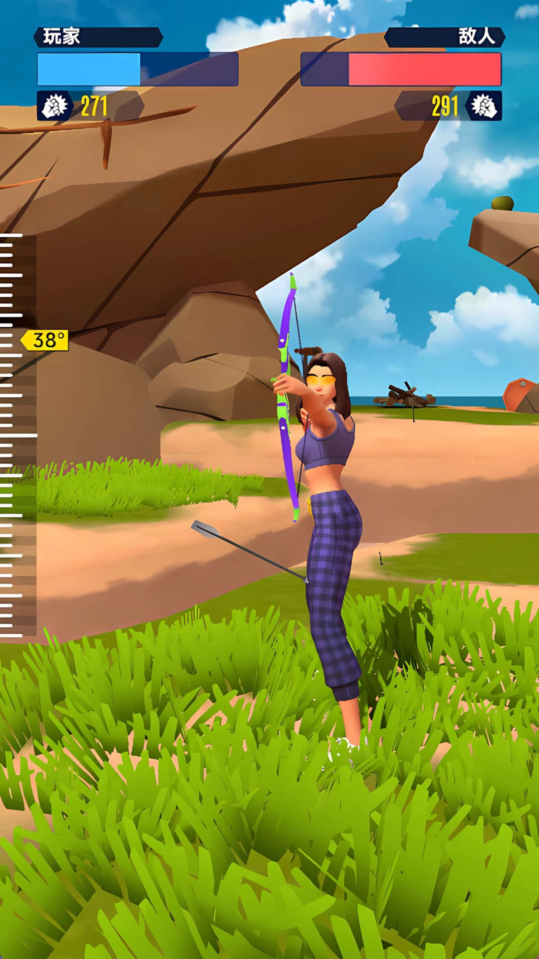 1、选择弓箭作为武器进入竞技场,通过虚拟摇杆操控角色移动,点击瞄准键进行攻击。