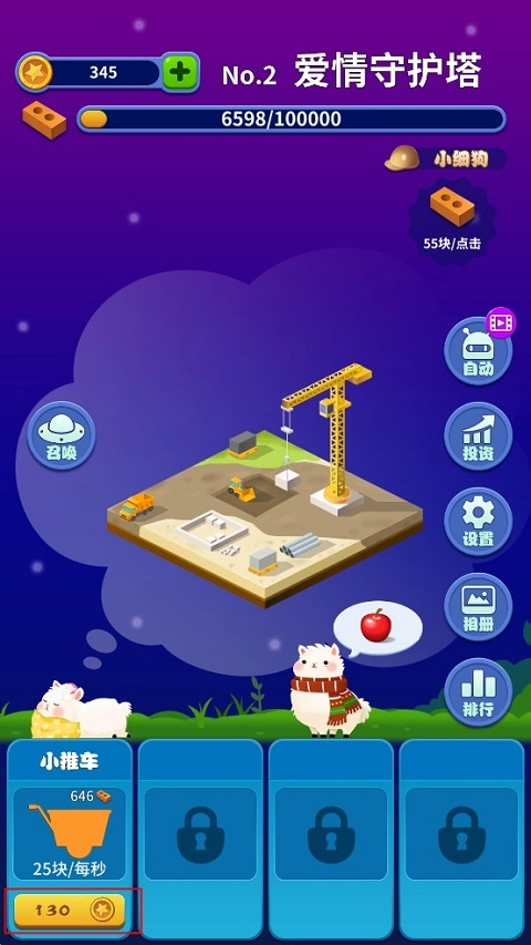 类似闯关一样的挑战模式,每一关都有不同的目标任务,期间你可以通过升级小推车或其他建筑工具,提升建造速率;还可以通过“ET 小问答”,增加搬砖能力,前提是回答正确;再有便是通过投资来提升金币获取的最大收益,利用金币升级建造工具。