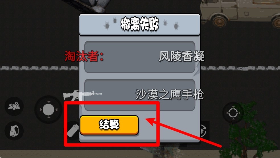 3.结算界面:战斗失败后,界面会呈现出淘汰者的信息以及其所使用的武器,点击“结算”按钮,即可迅速返回并重新开启下一轮挑战。
