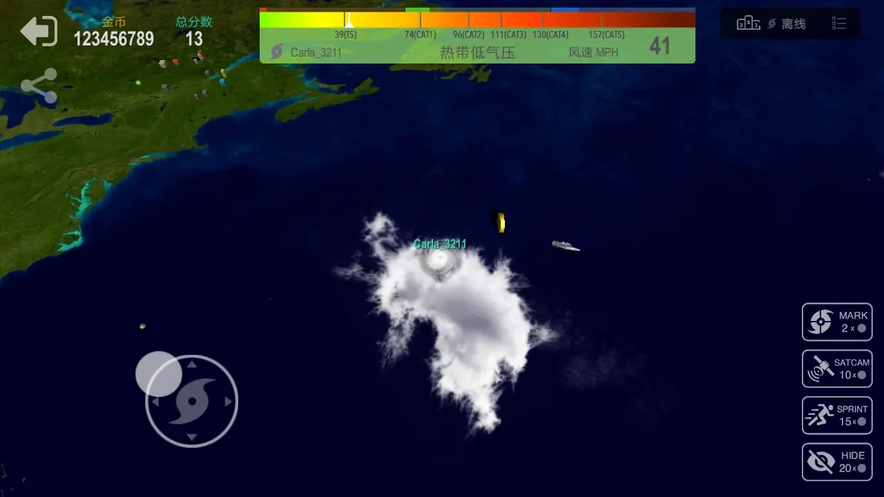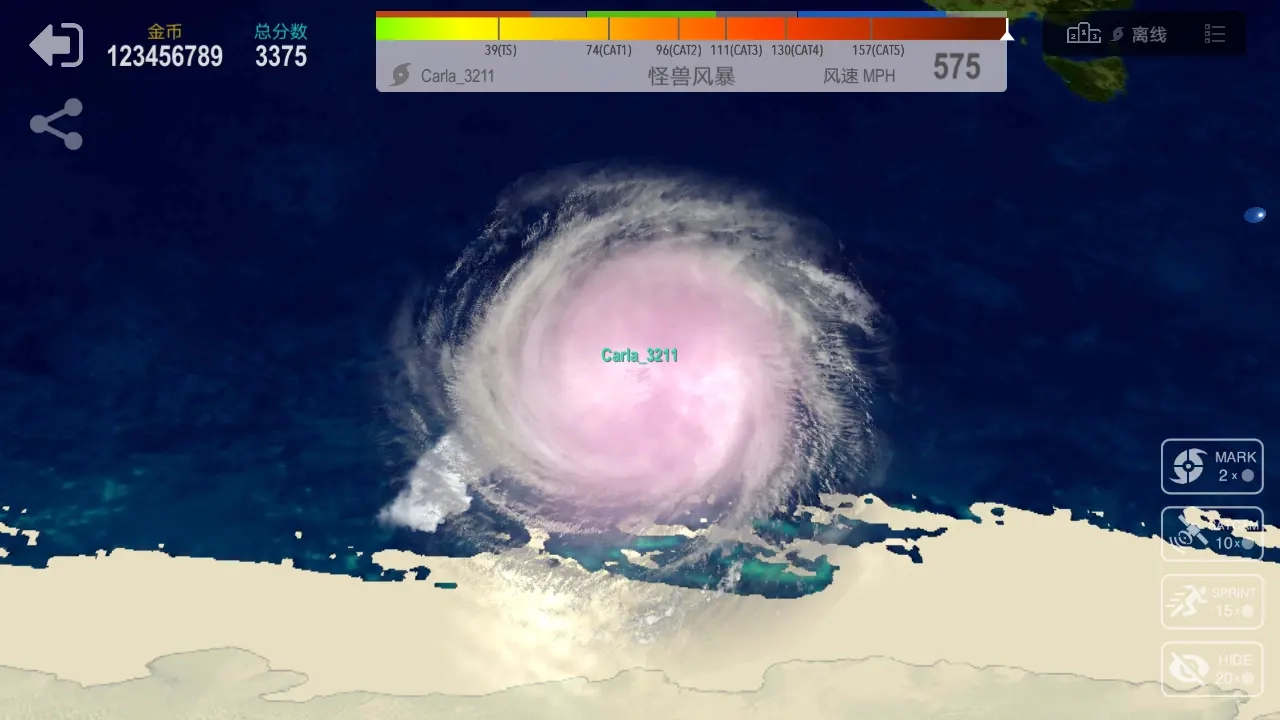 飓风大作战的玩法和贪吃蛇相似,玩家的核心目标是通过收集能量来达成最终任务。操作上只需滑动屏幕就能控制移动,右下角设有移动加速按钮。不过需要注意的是,能量来源于空气或海面中的水与热能,而主动猎杀比自身规模小的飓风,能让你更快地成长壮大!
