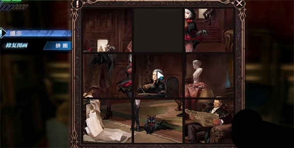 首先是左下角看报纸的男人往右平移一格,然后将猫所在的那一格往下移动。紧接着将最中间的书和一堆纸所在的格子往左移一格。然后来一个逆时针的转动,最终形成下图所示的图案。
