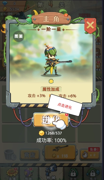 3、成功击退僵尸后,即可获取奖励,随后可对人物进行进化,以此提升各项参数。