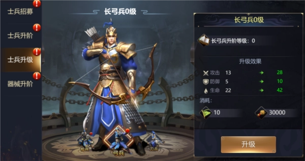 士兵可大幅度提升武将战力,士兵养成包括士兵升阶、士兵升级以及兵营升级