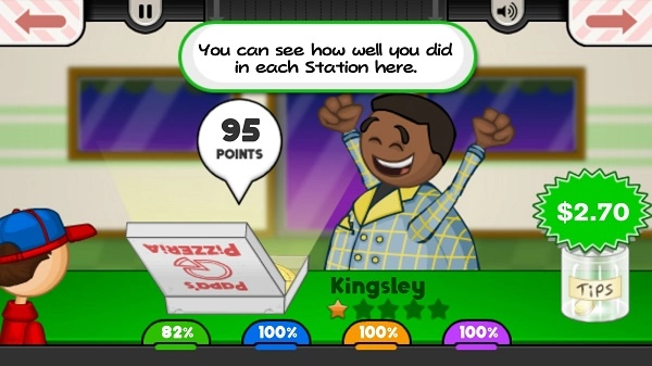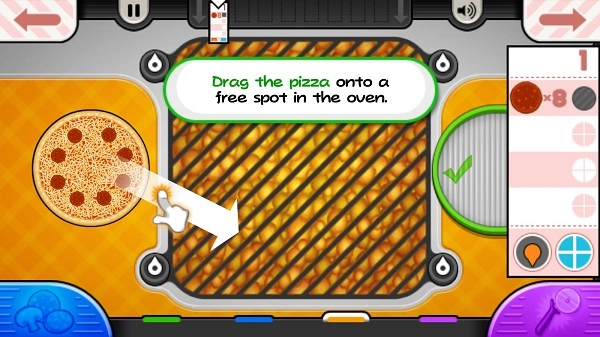 玩家在根据顾客所需的时间烘烤披萨。顾客可以选择将披萨煮到计时器刻度盘上的不同点。当披萨烤好后,玩家点击它可以将其移动到下一站。