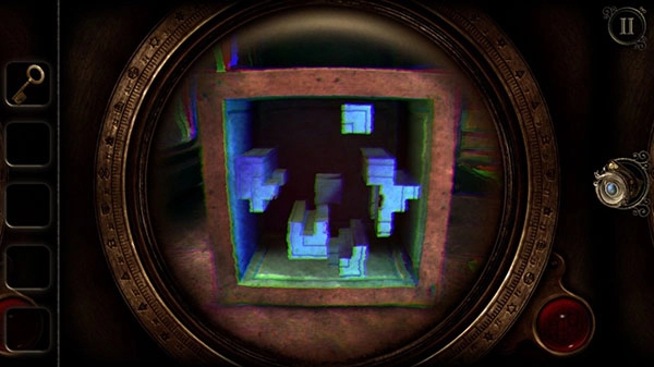9、按照教程提示,点击右侧目镜按钮戴上目镜,戴上目镜后可以发现一些肉眼观察不到的信息。双指聚拢退出箱子界面,再次双击靠近盒子,戴上目镜,可以观察到盒子内部有一些散落的方块,将其组合成一个正方体。