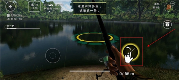 5、右边的按钮是抛竿,寻找到合适位置后点击此键抛竿即可;