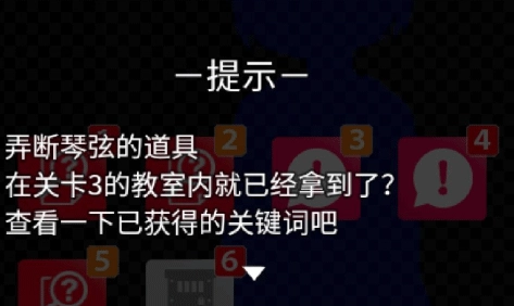 描述5 :“吉他”→“内部似乎有东西”----需要在搜索框翻到关键词“钳子”然后呼唤对方→“用钳子剪断弦”→“纸团中的金色小钥匙”(新关键词)。(尴尬,第一次卡关)