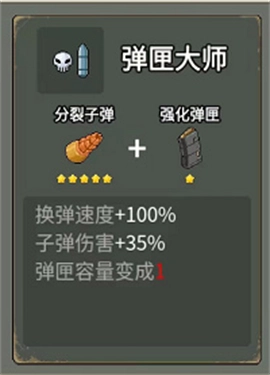 技能:换弹速度+100%、子弹伤害+35%、弹匣容量变成1