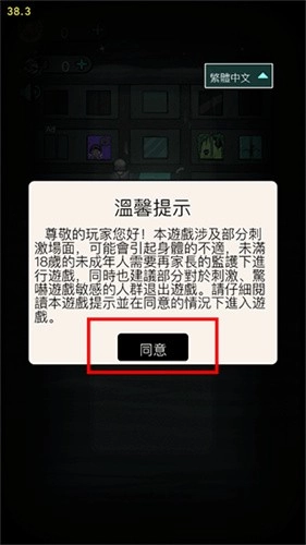 1、先打开手机里的haunteddorm国际服游戏,进入后默认是中文版本,得点击同意温馨提示,才能正式进入游戏。
