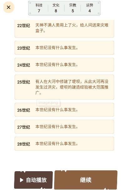 就能得到一个文明从创世纪到消亡的文本,每个文本都不相同,而且都很有趣味,我试过最好的一共是60世纪吧,只能告诉大家科技和宗教多点的话容易延长文明的寿命。