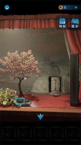 15、点击右边的小戏台,从手机中看到五个不同颜色高低的人偶。回到戏台场景,点击戏台树上挂着的五个蝴蝶。