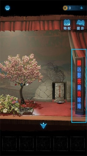 8、返回上一个房间,可以看到墓碑前的LED屏打开了,观察LED屏上的字体。根据屏上的红色字体顺序打开观众席左边座位上的盒子。注意顺序从上到下为奠-丧-婚-吉-嫁。这里给出第一步的操作方法,后面的操作就是很简单的。打开盒子后得到【化妆笔】。