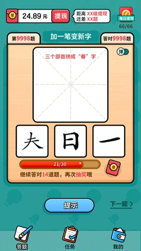 汉字高手红包版绝对是手机里不能少的休闲益智游戏,经典玩法保留的同时,总能带来新惊喜。和同类游戏比起来,它的可玩性特别强,在玩乐中还能学到知识,体验感超棒。不过你真的了解汉字吗?你确定自己认识汉字吗?随着关卡一步步解锁,更多让你眼前一亮的内容等着你来挑战,还能帮你缓解学习压力呢。游戏的画风也很简约清晰,玩法就是给指定汉字加一笔变成新字来通关,闯过的关卡越多,说明你的智慧和实力越出众。别犹豫啦,感兴趣的小伙伴赶紧来试试吧!