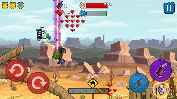 针对于游戏的玩法来说,其实还是比较简单的,左侧主要控制着赛车的重心,右侧以加速和炸弹释放为主,期间关卡中还有许许多多的障碍和路道设计,让每一关都尽显特色。