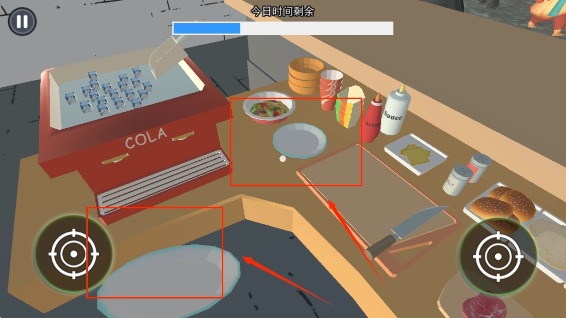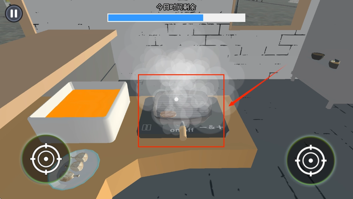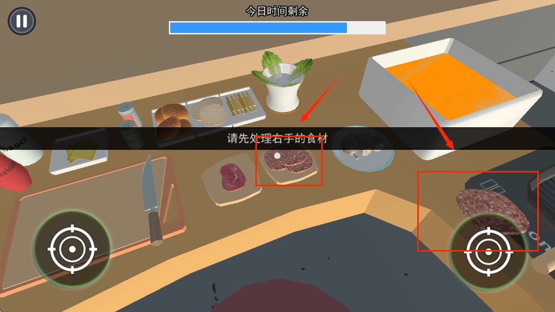 2、将屏幕中心点放在肉排上,点击左右边任意一个手拿起肉排。