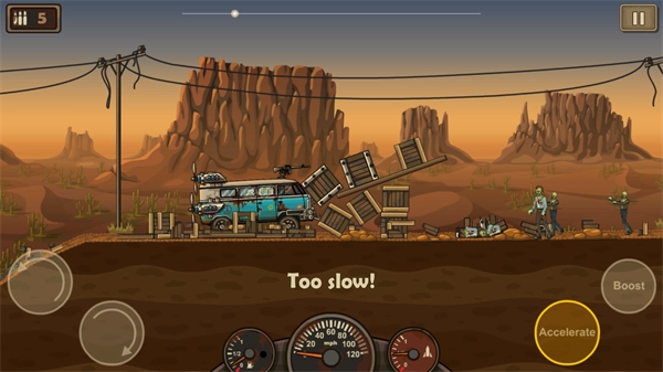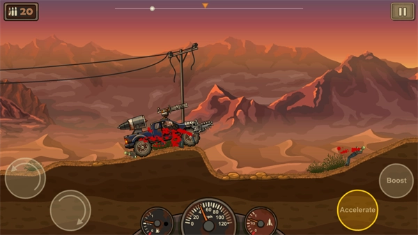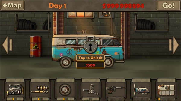 3、多多升级。游戏中玩家们及时失败了也可以获得金币,金币可以让我们对汽车进行升级,如提高汽车的加速、防御能力等等,还可以在汽车上配置武器从而将僵尸们消灭在远处,而这些装备对于玩家们过关来说无疑是最重要的了。