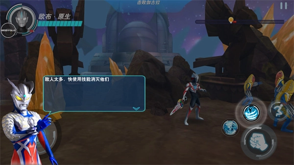 1、打开奥特曼格斗英雄游戏,通过滑动左侧的轮盘来操控角色移动;