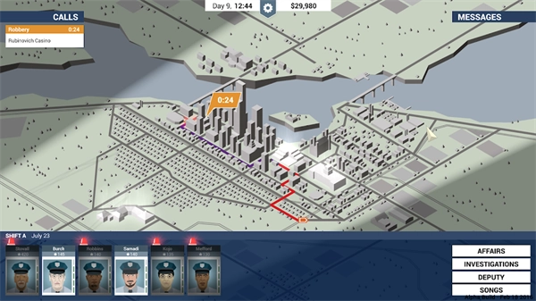 如果一切顺利,警察抓住罪犯并没人死亡。但事实是,有时罪犯设法逃脱。尽力避免任何的警察和平民的伤亡。警察伤亡会损害你的名单,而死去的平民会比活着人更让市长烦心。办案比较成功,会使专业值提升。若是让罪犯逃脱,那么专业值就会下降。警察还有一些额外的特征是看不到的,比如有的警察很懒惰,总是想法子请假;而有的警察则喜欢酗酒。你只能猜测这些东西,根据他们的表现来得出结论。当你的警察不确定如何处理事件的时候,他们也许会联系你,请你来处理这种情况。你要试着处理各种状况,但是不要把时间浪费到这些琐事上面,你还有很多其他的问题要处理。