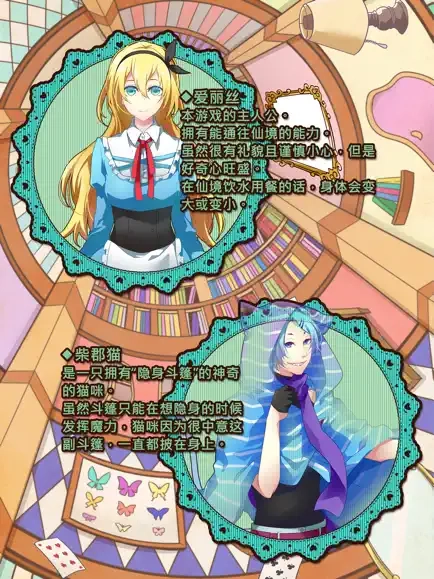 《爱丽丝和仙境里的猫》是由日本Lady Wizard团队开发,基于《爱丽丝梦游仙境》这一童话故事而创作的游戏。在原有世界观与人物设定上融入新的剧情元素。 真善美化身的爱丽丝是否也会受黑暗的侵蚀,在背后默默陪伴的身影是否会表明自我心迹,勇敢现身。