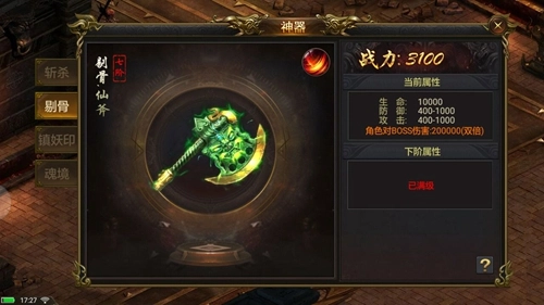 在神器系统中,有一神器名曰“斩杀”。提高斩杀的等阶,除了提供基础的生命、防御、攻击属性外,还能拥有概率秒杀怪物一定百分比血量的超绝属性。随着等级提升,秒杀不是梦