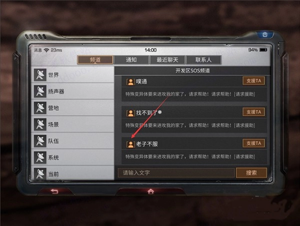 2、此时会弹出聊天界面页面,在该页面的【频道】这里玩家会看到此时其他玩家的发言,如果有想要加为好友的玩家,点击该玩家。