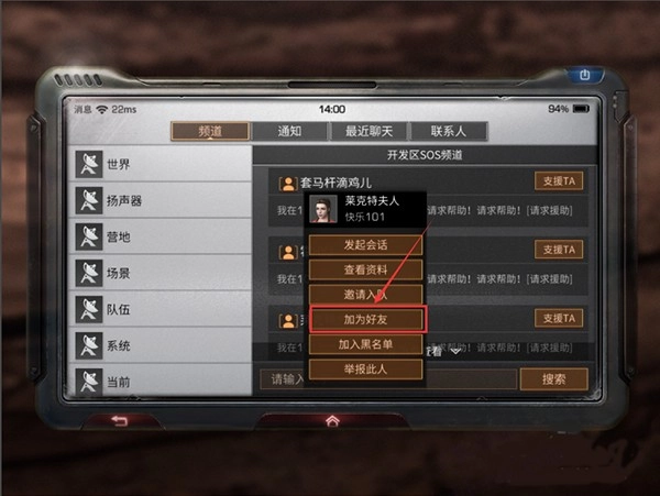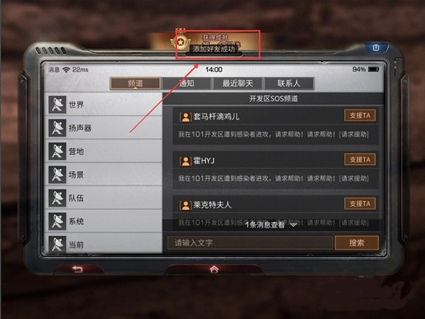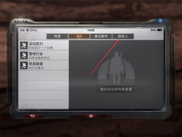 5、在下图页面的上方有频道、通知、最近聊天以及联系人四个功能,玩家也可以点击进入到【联系人】页面来添加好友。