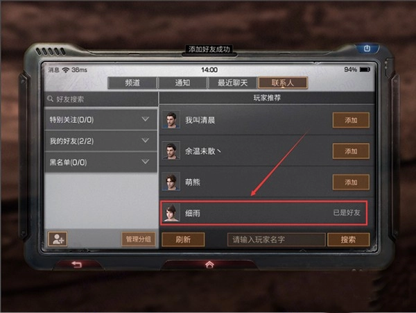 6、之后可以在【联系人】页面通过搜索来找到想要加为好友的玩家,如下图所示。