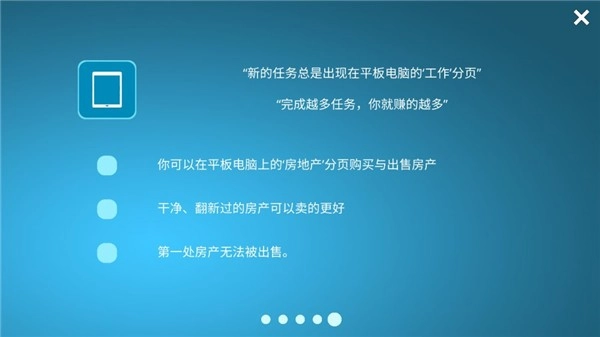 3、新的任务总是出现在工作分页,完成越多任务,你就赚的越多,你可以在‘房地产'分页购买与出售房产,干净、翻新过的房产可以卖的更好,第一处房产无法被出售。