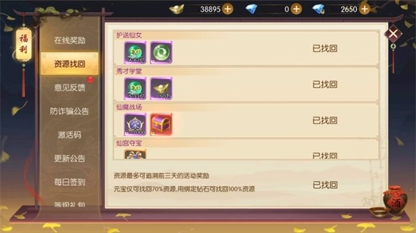如果错过活动,进行资源找回是最轻松提升综合实力的方式之一,特别适合那些每天上线时间不是很多的玩家。资源找回分为免费找回和魂晶找回两种方式,可以把大家前一天没有完成的任务以及副本的奖励全部找回,包括装备、材料以及经验值等。