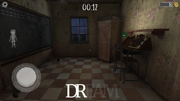 2、进入游戏后你会看到我们会出现在一个房间里,屏幕上会出现天数1,这里的天数就是指的生命,游戏在每次闯关时都提供给玩家五条命,每次被鬼修女抓到都会从新被抓回这间屋子,但是你所收集到的东西位置不会变,你所开开的屋门,柜子门等也不会关上。