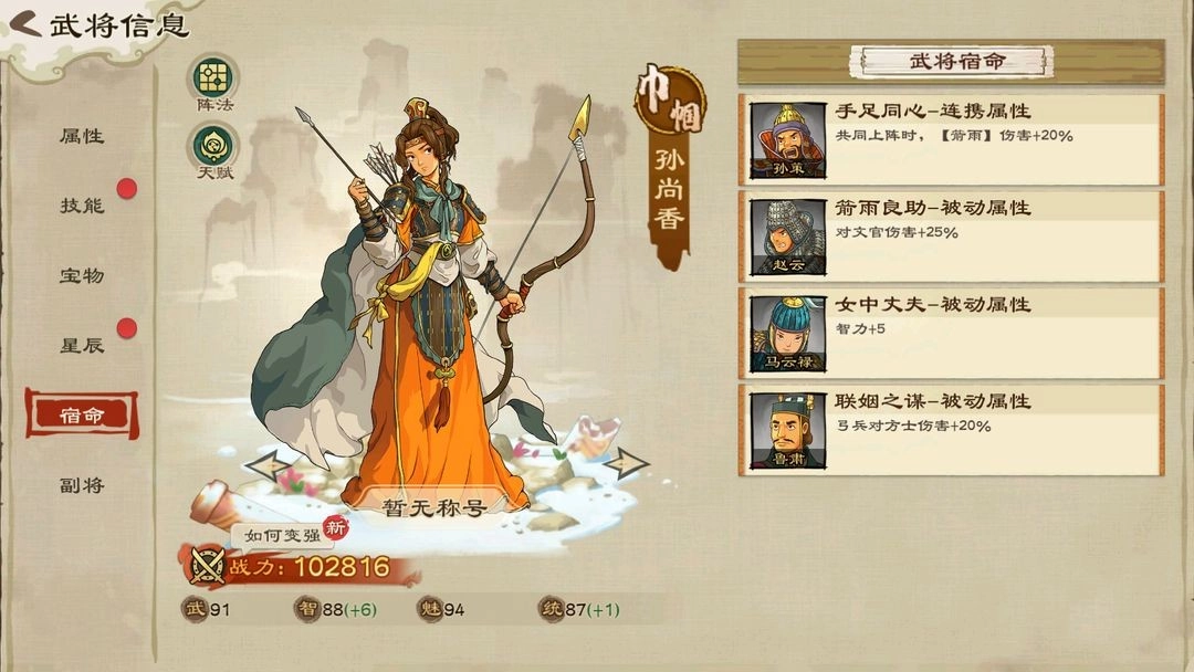 每个武将都有对应的宿命武将,解锁宿命武将可以激活宿命效果,激活后武将战斗力会得到显著提升。部分合击技需要两个武将同时上阵方能生效。