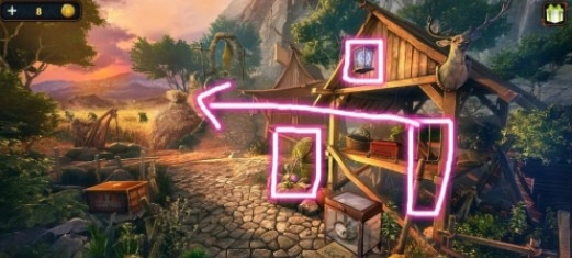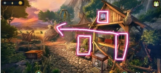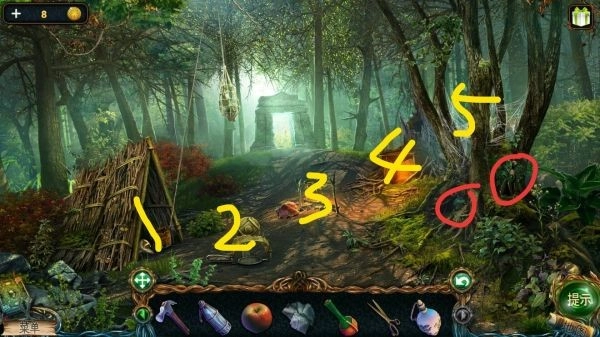 1桌子上有一个蜡烛,用桌子上的火苗点燃,得到蜡烛。捡起2处的绳子、3处的蘑菇。在4处翻找出蘑菇。用蜡烛把5筐子的绳子烧断,得到凿子。拿起6上边的勺子,把1桌子上的锅里的蘑菇舀出来,用凿子把蜡烛旁边的蜡凿开,得到密码。把三个蘑菇放到8树桩上,得到钥匙和一个手柄。到6处把帘子拉开,拽锁链,出现一个箱子,用钥匙开箱子,把手柄放在石头上,用绳子绑好,得到斧头。在7处,用斧头砍断树根,再用密码开箱,得到彩线。