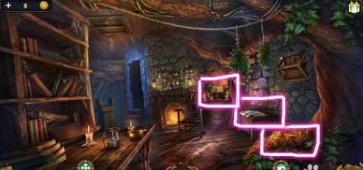 6.房间树根边的草里拿【镰刀】,后边的箱子将小开关安上,玩游戏,如图排列,得到【魔法球】.后边的抽屉里拿到【油灯】,上面拿到【蜡烛】,油灯在这关用不到.