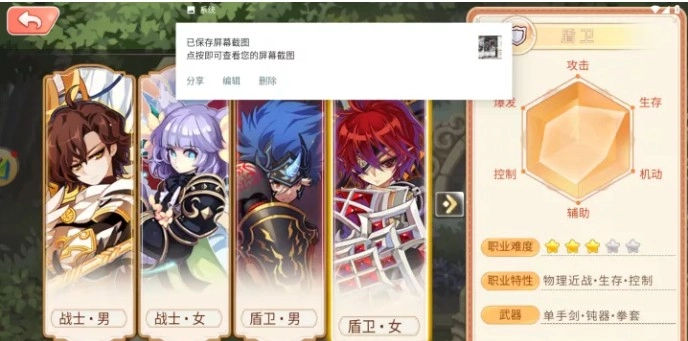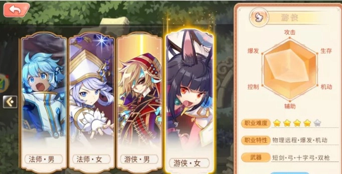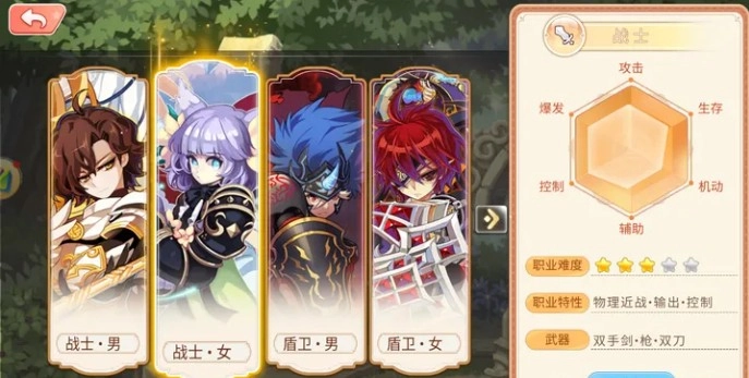 首先要进行职业选择,当前游戏里有战士、盾卫、法师和游侠这四种职业,每个职业都分男女,主要差别体现在外观上,性能方面没有显著不同。战士和盾卫属于对新手比较友好的职业,它们在各方面都相对平衡,战士的特点是输出能力略高一些,盾卫则在生存能力上更为出众,这两个职业都是近战类型的。
