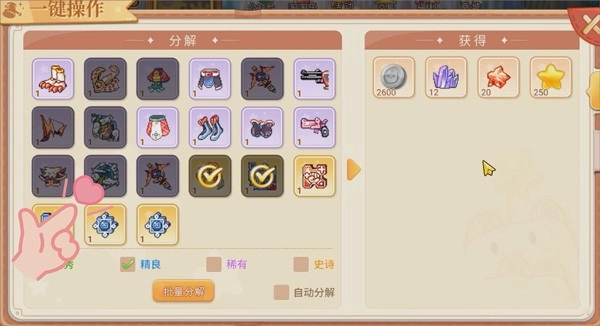 分解高品质的史诗级或稀有级别武器,除了星晶外,还可获得星币。星币可在彩虹商店中兑换各种史诗级别武器,使玩家在不喜欢的史诗级武器出现时,可以通过分解和商店交换来获得更喜欢的装备。