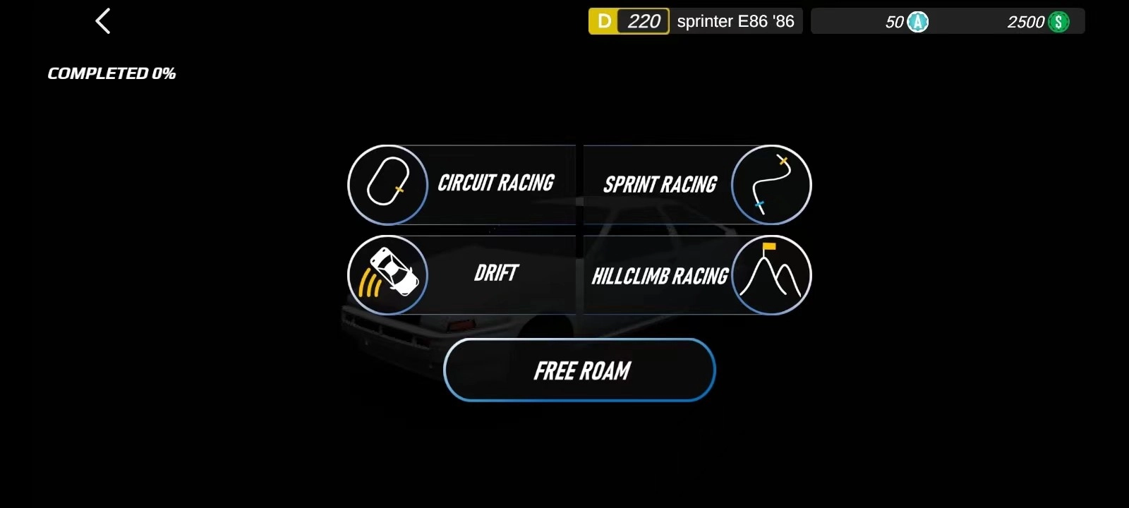 3、登录完成后,可看到包括赛车、短跑、漂移和爬坡比赛等游戏模式,玩家可自行选择体验,这里以赛车模式为例,