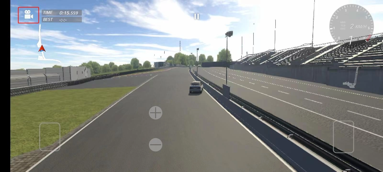 6、进入赛道后,我们可以通过左下方的按钮控制车辆方向,右边的刹车和油门按钮控制车辆速度,也可以通过摇动手机进行遥感控制,