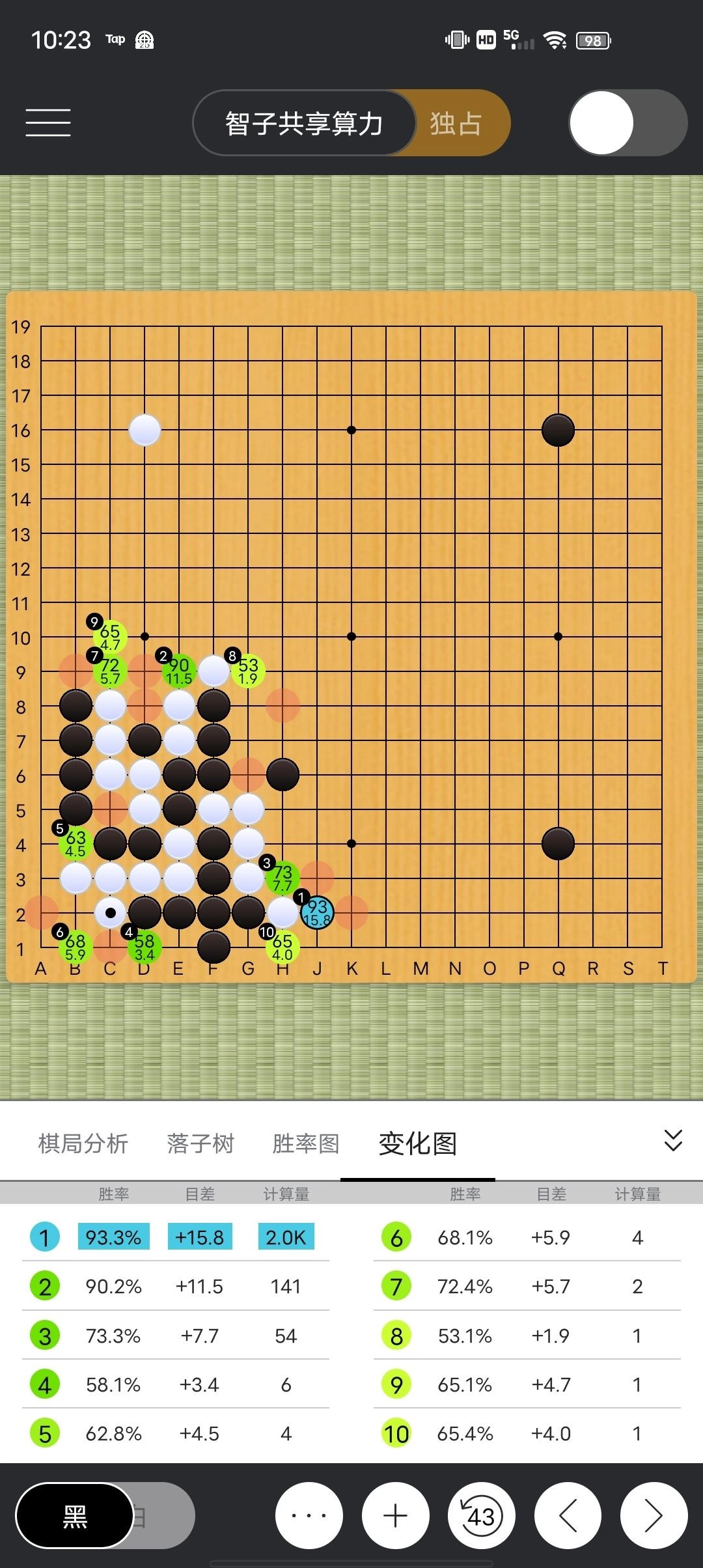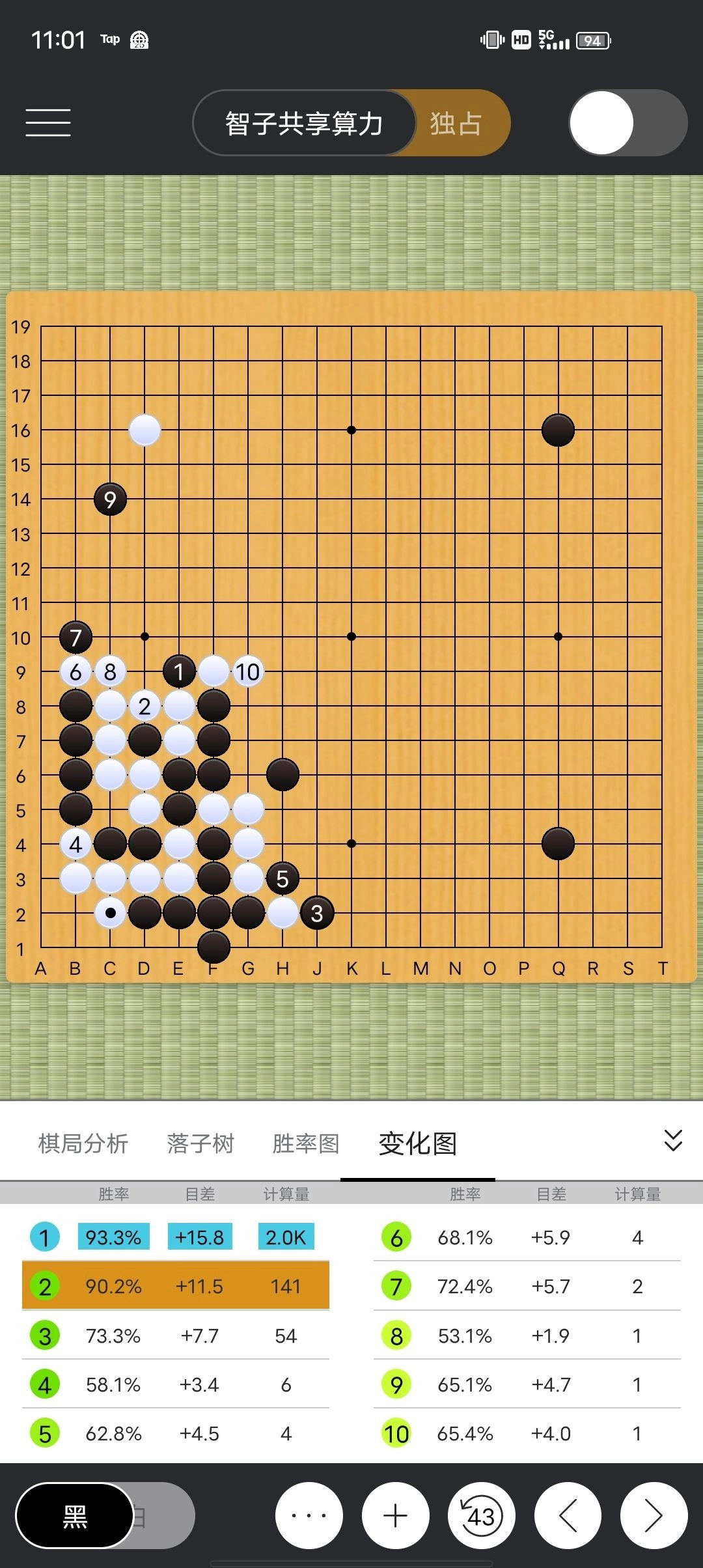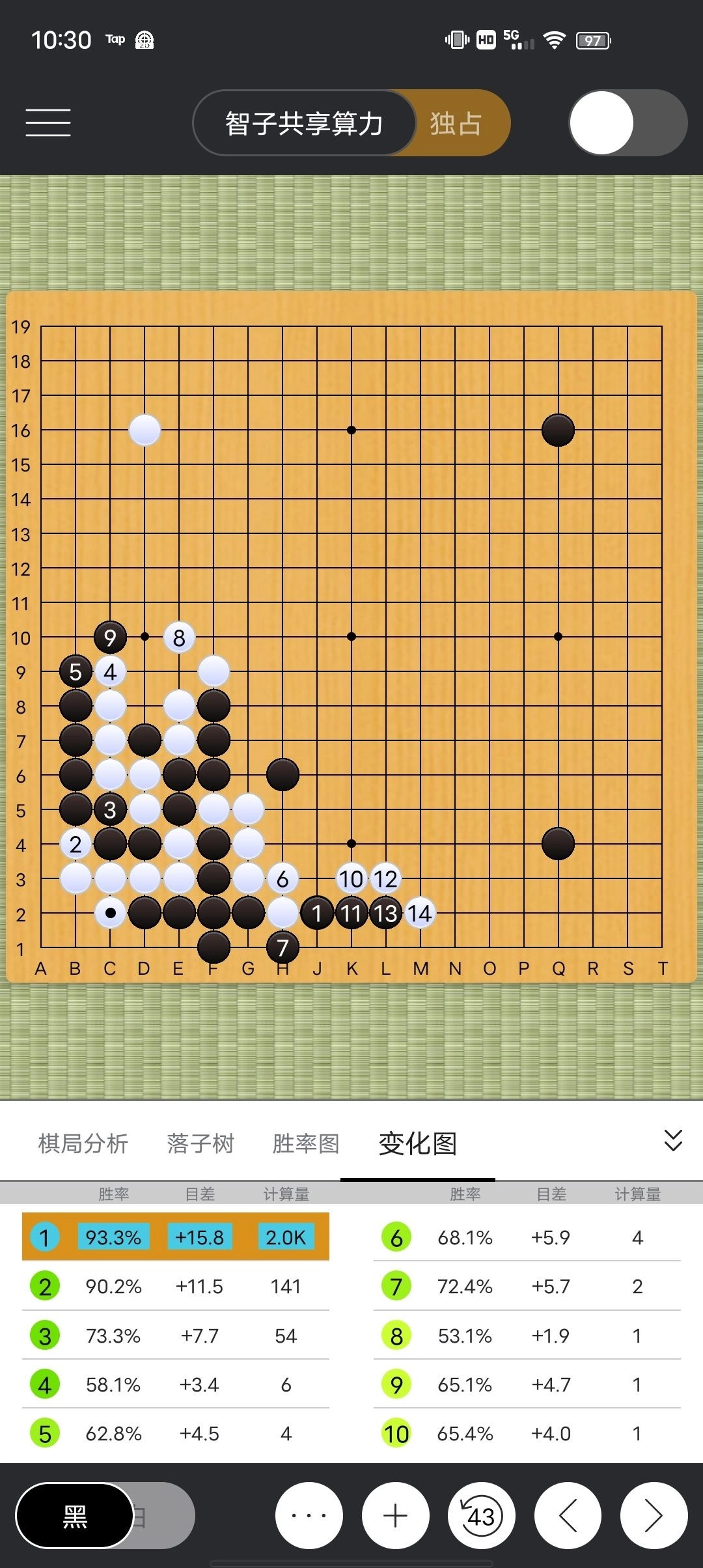 点开第1个变化图,发现算了14招,按这14手下完黑棋领先15.8目胜率93(胜率就是根据目差判断的)