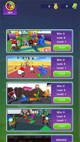 进入彩虹朋友大乱斗后,能看到包含多种不同规则的小游戏,挑选自己喜爱的关卡,点击“PLAY”即可。