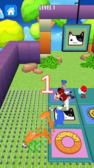 2、小编以方块淘汰赛为例,点击屏幕游戏开始,手指在屏幕下方上下左右来控制彩虹朋友自由移动,靠近其他玩家将其推下方块淘汰他。