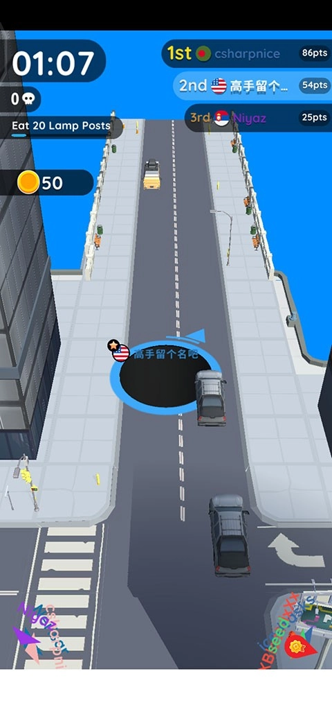 5、在游戏刚开始的时候,我们可以选择小一点的目标进行吞噬,例如人、垃圾桶、下水道井盖等小物品。
