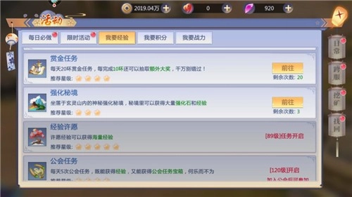 6、点击我要经验菜单,然后挑战仙灵之火、经验药水、强化秘境等副本也可以轻松升级
