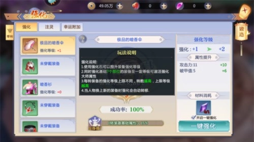 使用强化石可以提升装备强化等级,同时强化基础7个部位的装备至一定等级可激活强化大师属性。每转装备的强化等级上限不同,转数越高,上限等级越高,当人物换上新的装备时强化会自动转移。