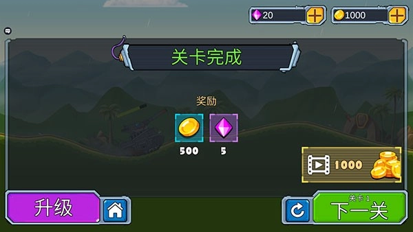 8、将地方坦克全部消灭后,就可以获得升级,得到金币和钻石奖励,用于升级或者点击“下一关”继续挑战。