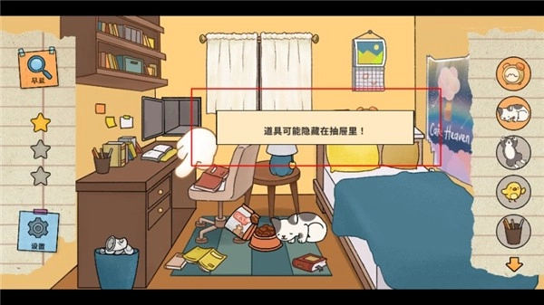 3、右侧是玩家需要找到的猫咪和物品,点击即可查看提示。