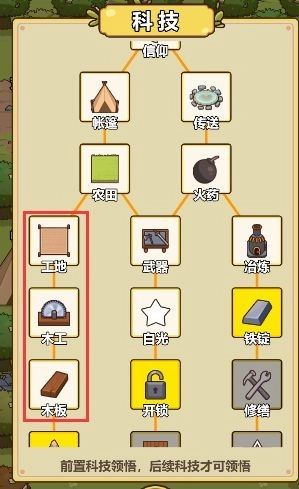11、生产建筑、生产,先学习科技场地,木工桌、木板。再与围墙里面的荒地交互,建造之后变成基座。与基座交互打开建造生产建筑界面,具体流程看下图例。