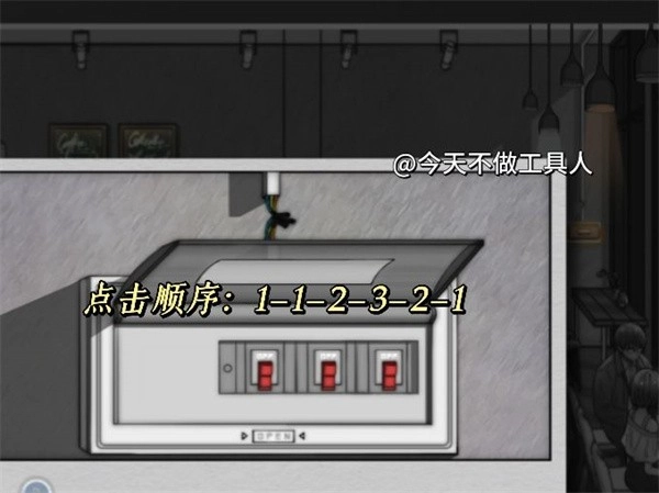 ①工具柜里取出工具,维修电箱,然后摁红色按钮,直到离我们最近的三盏灯亮。