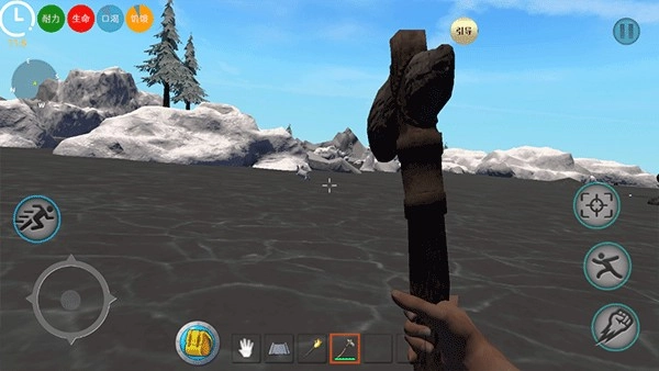 3、左上角是角色的耐力值,下方是持续奔跑,自由移动轮盘,右侧是瞄准、跳跃以及攻击,还是很好区分的,下方是物品栏,点击手按钮就可以拾取道具。