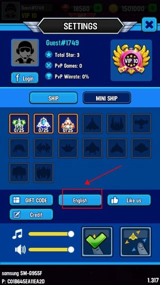 首次进入游戏,先快速完成游戏教程,之后返回主界面,点击左上角的“头像”,再点击箭头所指的“English”位置(参考图示)。