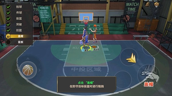 6、在对手要投球时,我们可以点击盖帽,跳起将篮球拍下。